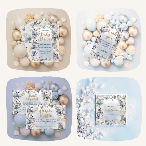 Die "Fuzzy, Soft, and Fluffy Arctic Animals Baby Shower Collection" - ein skurriles und herzzerwärmendes Thema, das die Ankunft eines wertvollen Freudenbündels feiern soll. Diese bezaubernde Kollektion verbindet den sanften Charme von sanften hellgrauen und sanften blühenden Pastellelementen mit der bezaubernden Präsenz arktischer Tierfavoriten. Ihre Babydusche verwandelt sich in ein winterliches Wunderland mit verschneiten Tigern, Siegeln, Bären, Füchsen, Eulen und Pinguinen, die alle in der süßesten und fließendsten Form dargestellt sind, die man sich vorstellen kann. Diese kleinen Kreaturen bringen eine Touch arktischer Magie zu Ihrer Feier und schaffen eine gemütliche und einladende Atmosphäre für Ihre Gäste. Die sanfte Farbenpalette und die zarten Blumenmotive in hellgrau und pastellblau verleihen dem Ganzen ein Gefühl der Ruhe und Entspannung, das perfekt für ein gemütliches Ambiente mit Babydusche ist, das Ruhe und Wärme ausstrahlt. Diese Sammlung ist ein Beleg für die zarten Momente, die Sie mit Ihren Lieben teilen, während Sie die Ankunft Ihres neuesten Familienmitglieds erwarten.