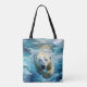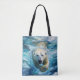 Arktische Illusion: Der schwimmende Monarch. Ein atemberaubendes visuelle eines majestätischen Eisbären, der aus dem eisigen Wasser auftaucht, gefangen in fließend stilisierten Wasserfarbenstrichen. Das Zusammenspiel von Licht und Wasser erzeugt einen ätherischen Effekt, als ob der Eisbär zwischen zwei Welten existiert - Realität und Traum.
