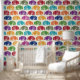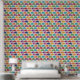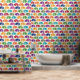 Richten Sie Ihr Zimmer mit dieser farbenfrohen Schale und der Tapete auf. Es zeichnet sich durch ein rundes Muster von bunten Gürtellos in marineblau, rot, goldgelb, orange, aquamarin blau, hellgrün, olivgrün, Himbeere aus und ist lila vor creme- oder elfenbeinfarbenem Hintergrund.