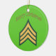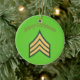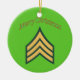 Armeediener Weihnachtsschmuck. Dieses Ornament ist auf der einen Seite mit den Insignien des Armeeoffiziers und den Worten "Frohe Weihnachten" und auf der anderen mit dem Weihnachtsmann mit einer Tüte Goodies dekoriert.