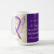 Arnold-Chiari Malformation nutzt ein lila Sensibilisierungsband, um seine Bekanntheit zu unterstützen. In dieser benutzerdefinierten Tasse werden lila Bilder der Engelszenografie mit der Meldung "I Hope and Support Arnold-Chiari Malformation Awareness" (Ich hoffe und unterstütze Arnold-Chiari Malformation Awareness) gezeigt. Die lila Bewusstseinswächter Engel Band Art Fotokaffeemassen oder Tasse können mit personalisierten Nachrichten versehen werden, um so wichtige Tasse für Bewusstseinsspendengeber, Sensibilisierungsbecher oder andere besondere Veranstaltungen zu schaffen, oder um Unterstützungsanlässe zu schaffen. Machen Sie Ihre eigenen personalisierten Worte für eine persönliche Botschaft der Hoffnung und Unterstützung zu teilen!