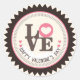 Ein auffälliger Valentinstag-Aufkleber mit dem Rundtext "Happy Valentine's Day", der ein einzigartiges Design des Wortes "LIEBE" umgibt. Die moderne Farbpalette ist Elfenbeinweiß, schokoladenbraun und Bublegum pink.