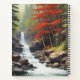 Un bosque vibrante con árboles verdes y otros con hojas rojas, atravesado por un arroyo que forma cascadas. Un escenario natural hermoso y relajante.
