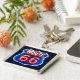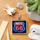 Dieser große quadratische Premiummetall-Schlüsselanhänger mit seinem Bild eines Route 66 rot, weiß und blau Neonzeichens auf schwarz, ist ein geeignetes Gastgeschenk für ein 20er, 40er und 60er Jahrzehnt Party!