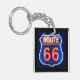 Dieser viereckige, doppelseitige Acryl-Schlüsselanhänger mit dem Bild eines roten, weißen und blauen Neonzeichens der Route 66 auf schwarz ist ein passendes Gastgeschenk für ein 20er, 40er und 60er Jahrzehnt Party!