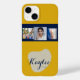 Art Collage Script Monogram iPhone Case Dieses schöne Flitterwabenfarbene Handy-Gehäuse verfügt über Skripttypografie mit Namenspersonalisierung und eine drei Bild-Collage in einem blauen Rahmen. .Es ist künstlerisch, schön und absolut einzigartig.