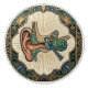 Explore the intricate beauty of the human auditory system with this stunning Art Deco-inspired ceramic pull. This design features a detailed illustration of the ear's anatomy, showcasing the cochlea, semi-circular canals, and outer ear in a vibrant palette of green, blue, and orange hues. The graphic is framed by a decorative Art Deco border, adding a touch of vintage elegance to any piece of furniture. Perfect for those fascinated by science, medicine, or unique artistic expressions, this pull brings a sophisticated and educational flair to drawers, cabinets, or any other decorative application. Add a touch of vintage charm and anatomical wonder to your home decor.