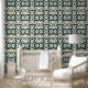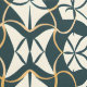 Dieses Kunstwerk zeichnet sich durch ein kompliziertes, durch Art-Deco-Design inspiriertes Muster aus, das sich durch fließende, symmetrische Linien und geometrische Formen auszeichnet. Das Design wird in einer raffinierten Palette von aquamarinen, cremefarbenen und subtilen goldenen Akzenten gehalten, die ein elegantes und elegantes Ambiente schaffen. Die sich wiederholenden Motive bilden ein komplexes, miteinander verwobenes Muster, das sowohl Harmonie als auch Bewegung ausstrahlt. Die Kombination aus Kurven und scharfen Winkeln verleiht dem Design eine dynamische Qualität, während das Farbschema ein Gefühl der Zeitlosigkeit und des klassischen Stils bewahrt.