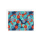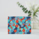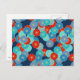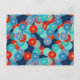 Eine Art-Déco-Postkarte, die auf einem traditionellen, stilisierten Chrysanthemum-Muster basiert, das in japanischen Textilien verwendet wird, in den Farben blau, türkis und hell rot, in Gold, auf dunkelblauem Hintergrund