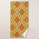 Dieses Handtuchhandtuch-Set hat ein Art Deko-Design aus Diamantformen, die aus überlappenden Winkeln in schwarzen, orangefarbenen und gelben Linien bestehen, mit diagonalen schwarzen Linien, die das Design wie Raute aussehen lassen