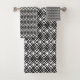 Dieses Handtuch-Set hat eine Art Deko-Design überlappende Diamanten in schwarz auf einem Feld von Weiß.