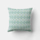 Dieses Kissen hat eine Art Deko-Design von überlappenden Diamanten in Verditer (grün) und blau auf einem Feld von Weiß.