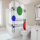 Dieser Duschvorhang ist mit einem Deko aus Buntglasfenstern mit schwarzen Linien, roten, blauen und grünen Quadraten und Kreisen gestaltet.
