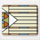 Art-Déco-farbenes Glas mit Dreiecken und Rechtecken mit blauen, orangefarbenen, blassgelben und blattgrünen Elementen.