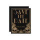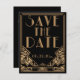 Eine kühne und elegante, Vintage Hochzeit Save the Date Ankündigung mit einem rauschenden Thema "Great Gatsby" in Schwarz und Gold. Ein schwarzer Hintergrund unterstreicht die aufwändige geometrische Gestaltung im Art-Déco-Stil in goldenen Beige-Tönen. Dekorative, stilechte Schriftart sind für Ihre Veranstaltungsformulierung ausgewählt.