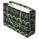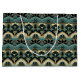 Treten Sie ein in die Roaring Twenties mit diesem beeindruckenden Art Deco-inspiriert Gold und aquamarinen großen Papiertüte. Dieses Design, das in Gold, aquamarin und Schwarz ein kompliziertes geometrisches Muster aufweist, spiegelt die Eleganz und den Glamour der Jazzzeit wider. Fette Linien, Fanmotive und ein metallischer Effekt verleihen ihm ein Vintages und elegantes Ambiente - perfekt für Liebhaber der klassischen Ästhetik und des Great Gatsby Stils.