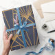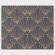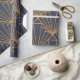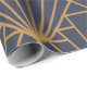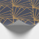 Dieses Verpackungspapier hat ein kunstvolles Deko-Design von Diamanten und Dreiecken in Gold auf einem blauen Feld.