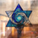 Dekorieren Sie Ihre Fenster und/oder Türen an den Feiertagen oder das ganze Jahr "rund mit diesem wunderschönen Art Deco Stil Magen David (Star of David), der das Aussehen von Buntglas in brillanten Tönen von königsblau und weiß. Originelles Design von Leslie Sigal Javorek.