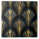 Diese Keramik-Kachel weist ein Art-Deco-goldfarbenes, nahtloses Muster auf, mit einem stilisierten Schwarz- und Goldmuster auf dem Hintergrund. Die symmetrische Anordnung und das Farbschema der Dunkelnavy und des Hellzyan schaffen ein faszinierendes visuelles Erlebnis. Das von einem Architekturillustrator entworfene Design ist nahtlos und wiederholbar, was es zu einer vielseitigen Wahl für verschiedene Räume macht.