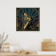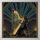 An elegant minimalist Art Deco poster featuring a graceful harpist in silhouette. This sophisticated design uses a striking gold and midnight black palette with classic sunburst and pillar architectural details. A timeless piece of musical wall art perfect for upscale living rooms, grand pianos areas, or professional music studios