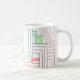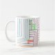Diese Tasse hat ein Art Deko Design von Linien in lila, rosa, orange und blau.
