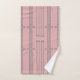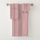 Dieses Handtuchhandtuch Set hat ein Art Deko Design von vertikalen Linien mit Diamanten und Kreise in Silber auf einem Feld von rosa.