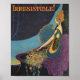 Vintage Kunst Deko-Design von Frau mit einer Dusche von Blüten und der Überschrift "Unwiderstehlich!" Farbenfrohe Purpur, Blues und Golden. Vintag Mavis Parfüm.