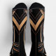 This abstract Art Deco design exudes luxury and sophistication with its sweeping metallic arcs in gold, copper, and grey against a deep black background. Symmetrical curves converge towards a central focal point, framed by sharp angular lines and vertical patterns, evoking glamour and retro elegance. Perfect for elevating home decor, office art, and stylish accessories with a timeless, opulent aesthetic.