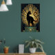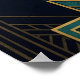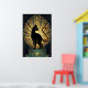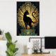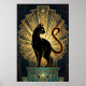 A refined black cat profile silhouette framed by a single golden halo circle and subtle teal rays. This minimalist art deco masterpiece with clean negative space embodies 1920s elegance for sophisticated modern interiors and cat enthusiasts.