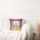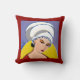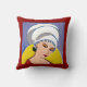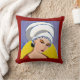 Kissen in einem modernen, halb abstrakten Art-Déco-Porträt einer Dame in Rot mit weißem Turban, gelb und blau-grau-Hintergrund