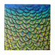 Dekorative Kachel mit einem nahen Teil der wunderschönen Federn auf dem Nacken einer Pfaue, die ein exquisites Kunstmuster wie Deko bilden, und die die bunten irisierenden grünen, blauen, bronzenen und gelben Details dieser Federn hervorhebt. Einzigartige und schöne Zuhause- oder Gartendekoration für Vögel und Naturliebhaber. Foto aufgenommen in Arcadia, Kalifornien.