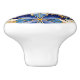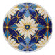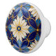 Ein symmetrisches Blumenmuster zeichnet sich durch die in Gold umrissenen weißen Blütenblätter vor tiefblauem und hellblauen Hintergrund aus. Das Design strahlt Eleganz und Faszination aus und schafft ein visuell auffälliges Motiv.