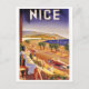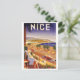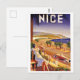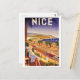 Diese Postkarte ist eine Nachbildung eines Vintagen Art-Déco-Reiseplakats für Nizza, Frankreich und ein atemberaubendes Kunstwerk. Das Poster bietet eine elegante Dame, die sich auf einem Balkon mit Blick auf die Stadt unten entspannt. Die Stadt ist im Art-Déco-Stil gestaltet, wobei sich auf der von Palmen gesäumten Straße neben den klassischen Autos modische Gäste tummeln. Die Straße kurbelt um die Küste zu Hügeln am Horizont, und es gibt Menschen am Sandstrand und Segelboote auf See. Der Vordergrund ist voller Blume, die der Szene eine Touch von Schönheit und Eleganz verleihen. Es ist eine großartige Möglichkeit, sich an Ihre Reise nach Nizza, Frankreich, zu erinnern oder Ihnen inspirieren, eine zukünftige Reise zu planen.