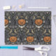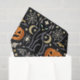 Ein dramatisches, im Art Deco-Stil inspiriertes Halloween-Wiederholungsmuster vor einem tiefschwarzen Hintergrund, das elegante, stilisierte schwarze Katzen mit leuchtend grünen Augen in einem kühnen, symmetrischen Rhythmus zeigt. Klassische Halloween-Motive – Kürbislaternen, Mondsicheln, Fledermäuse, Spinnen, Spinnennetze, Hexenhüte und funkelnde geometrische Sterne – werden in raffinierten Deco-Formen mit sauberen Linien und elegantem Kontrast dargestellt. Eine begrenzte Farbpalette aus tintenschwarzen, warmem Kürbisorange, Champagnergold und weichem Elfenbein erzeugt eine glamouröse, nächtliche Stimmung, die luxuriös und anspruchsvoll statt verspielt wirkt.