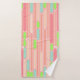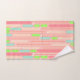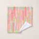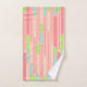Dieses Handtuchhandtuch-Set hat einen Deko inspiriert Design aus langen Ovalen gefüllt mit festen Farben oder Linien in Rosa, Grün und Blau.