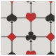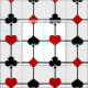 Dieser Stoff ist mit einem Art-Deco-inspirierten Original-Design mit einem Kartenspiel-Thema, bestehend aus leuchtend roten und schwarzen Kartensymbolen (Diamant, Club, Herz & Spade), zentriert auf den schwarzen, dicken und dünnen horizontalen und vertikalen Linien eines Rasters, mit einem großen, benutzerdefinierten Textfeld für Ihr Monogramm in der Mitte.