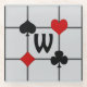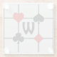 Dieser personalisierte Untersetzer bietet ein Art-Déco-inspiriertes originales Design mit einem Kartenspiel-Thema, das aus Anzug-Symbolen (Diamant, Klub, Herz & Pik) besteht, die sich in der Mitte auf schwarz-dicke, dünne, horizontale und vertikale Linien eines Rasters treffen, mit einem großen benutzerdefinierten Textfeld für Ihr Monogramm in der Mitte.