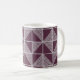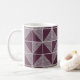 This mug has an art deco design of squares divided in half by diagonal lines of silver. The squares are then pieced together on a field of purple.