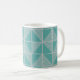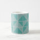 Diese Tasse hat eine Art Deko-Design von Quadraten in der Hälfte durch diagonale Linien von Silber geteilt. Die Plätze werden dann auf einem türkisfarbenen Feld zusammengefügt.