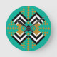 Diese Uhr hat ein kunstvoll inspiriertes Deko-Design von Diamantformen in Schwarz, Weiß und Bräune auf einem aquamarinen Feld.