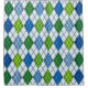 Dieser Duschvorhang hat ein Art Deko-Design aus Diamantformen, die aus überlappenden Winkeln in schwarzen Linien in Blau und Grün mit diagonalen schwarzen Linien bestehen, die das Design wie Raute aussehen lassen