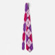 This tie has an art deco design of diamond shapes made from overlapping winkel in shades of purple and pink with diagonal black making the design look like argyle