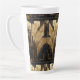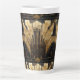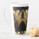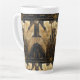 Hübsche Latte-Tasse mit einem goldenen, braunen und schwarzen Art-Déco-Muster, das wie hohe Wolkenkratzer vor einer abstrakt aufgehenden Sonne aussieht.