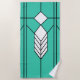 Dieses Badetuch hat ein Kunstfenster aus Deko, in dem Diamanten und Linien in Weiß, Schwarz und Türkis gehalten sind.