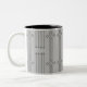 Diese Tasse hat ein Art Deko-Design von vertikalen Linien mit Diamanten und Kreise in Silber auf einem Feld von grau.