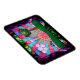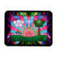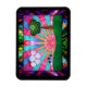 Ein digitales Buntglasdesign im Art-Déco-Stil, das im 20. Jahrhundert beliebt war. Das weithin verwendete Sonnenburstmotiv ist zentral und erhebt sich hinter einer grünen Landschaft, die von einem Baum auf der einen Seite und Wolken und Blume auf der anderen Seite ausgeglichen wird. Geometrische Formen werden verwendet, um die Symmetrie der Szene zu betonen, wobei der Baum und die Wolken aus überlappenden Kreisen bestehen. Verschiedene farbenfrohe Fraktal verleihen der "gläsernen" Textur und dem Interesse. Die Szene ist gerahmt in schwarzen Eisenarbeiten und diamantförmigen Blöcken, mattiert mit dunklen, aber lebendigen Fraktal-Mustern.
