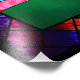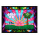 Ein digitales Buntglasdesign im Art-Déco-Stil, das im 20. Jahrhundert beliebt war. Das weithin verwendete Sonnenburstmotiv ist zentral und erhebt sich hinter einer grünen Landschaft, die von einem Baum auf der einen Seite und Wolken und Blume auf der anderen Seite ausgeglichen wird. Geometrische Formen werden verwendet, um die Symmetrie der Szene zu betonen, wobei der Baum und die Wolken aus überlappenden Kreisen bestehen. Verschiedene farbenfrohe Fraktal verleihen der "gläsernen" Textur und dem Interesse. Die Szene ist gerahmt in schwarzen Eisenarbeiten und diamantförmigen Blöcken, mattiert mit dunklen, aber lebendigen Fraktal-Mustern.