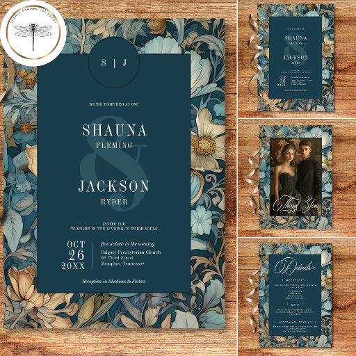 Lassen Sie sich verzaubern von unserer Vintagen Blumenhochzeit und sparen Sie die Dattelkarten. Inspiriert durch die ikonischen Entwürfe von William Morris, bieten diese Einladungen eine faszinierende Mischung aus Vintagen Tönen - tiefe aquamarine Blues, weiche Tans, Golden und Cremes. Die aufwändigen Blumenmuster, die an die Jugendstil-Ära erinnern, strahlen eine Touch der Dunkelheit aus und verleihen Ihrem besonderen Tag einen geheimnisvollen Reiz. Der dunkle, aquamarine Textbereich mit eleganter Vintager Schrift bildet einen auffallenden Kontrast zur reichen Blumenkulisse. Dieses zeitlose Design vereint klassische Romantik und ist somit die perfekte Wahl für Paare, die eine wirklich einzigartige und unvergessliche Einladung suchen. Erstellt von der einfachen Farmhouse Press.