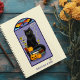Eine schwarze Katze sitzt auf einem Haufen Bücher mit roter Kerze, Kürbissen, mit Augen Sushi und einem Schmetterling aus Fleckglas in lila und hellgelber Umgebung.