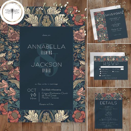 Indulge in the enchantment of the past with our vintage floral wedding invitations. Inspired by the iconic designs of William Morris, these invitations feature a mesmerizing blend of teal blues, pinks, creams, and green. The intricate floral patterns, reminiscent of the Art Nouveau era, this design adds vintage allure to your special day. The dark blue text box, adorned with an elegant vintage font, provides a striking contrast against the vibrant floral backdrop. This timeless design captures the essence of classic romance, making it the perfect choice for couples seeking a truly unique and unforgettable invitation. Created by Simply Farmhouse Press.